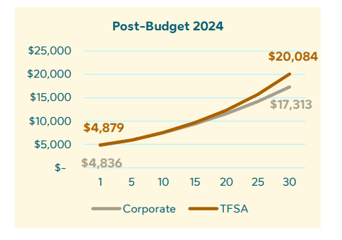 Since the 2024 Federal Budget made changes to the capital gains inclusion, the time needed for a TFSA to beat corporate investments by more than 1% is much quicker due to increased taxation on corporate capital gains. Yay more taxes!